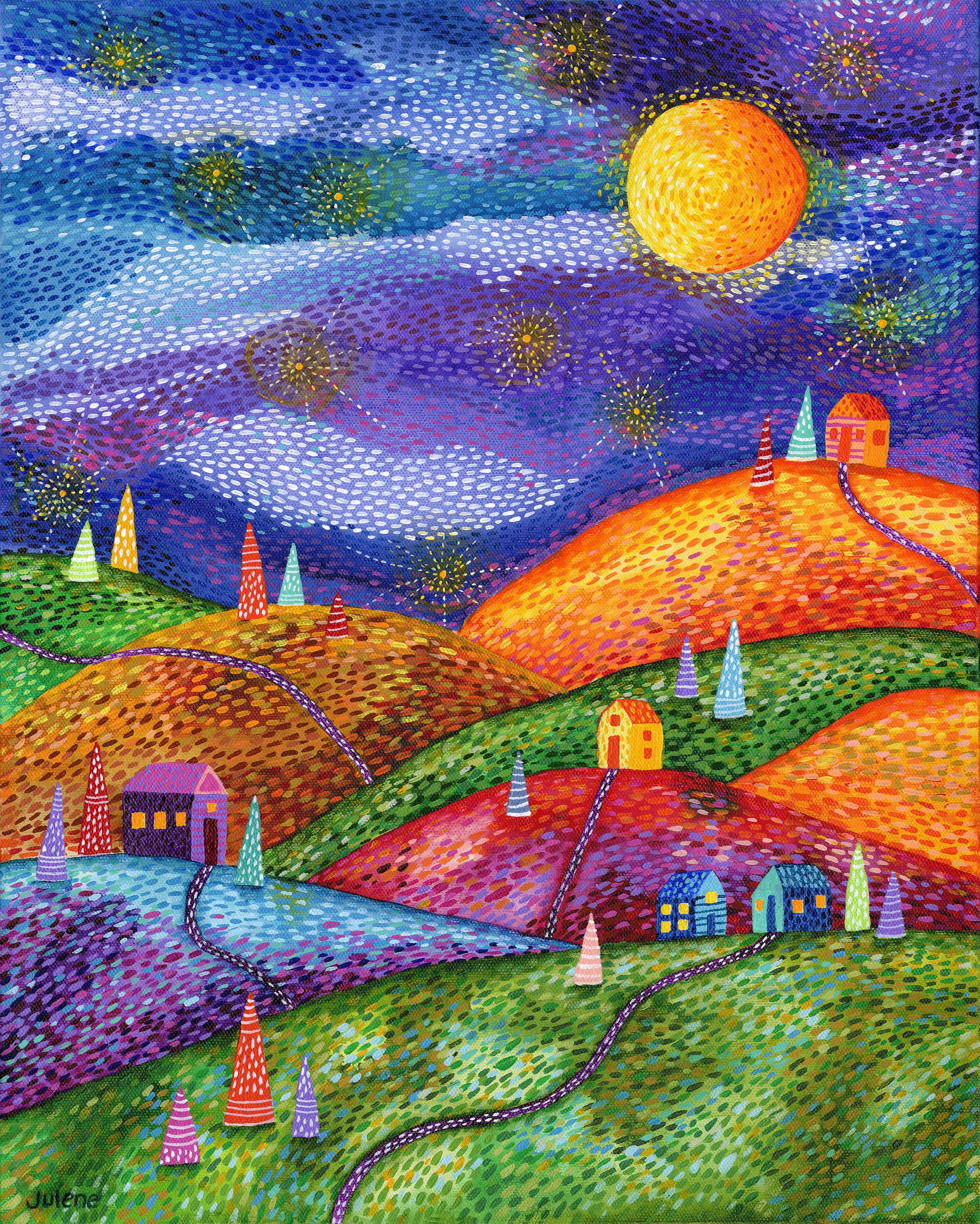 Dusk descends on the hills of my home. The lights of my community glow. A time when your door is open for a conversation. A time to share your bountiful harvest. A time of coming together when there is loss. A time of baking bread for those that are in need. A circle of community, this is the spirit and the fabric that joins us. This is a printed canvas.