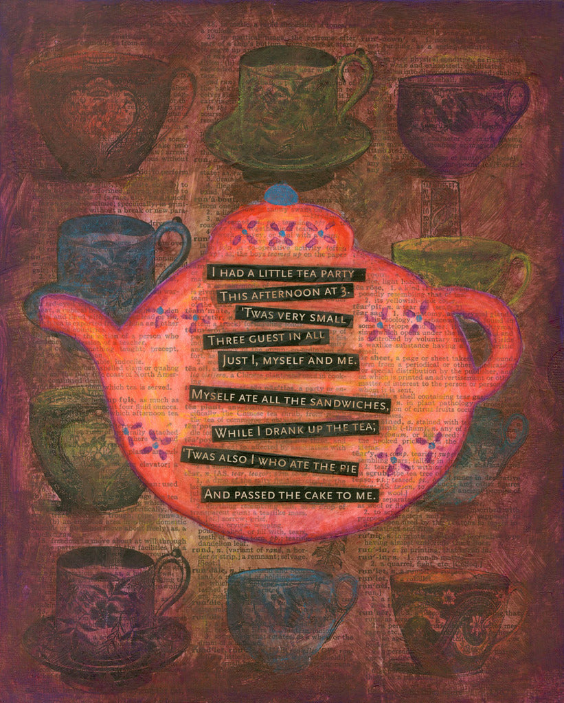 Created with mixed media consisting of dictionary pages - note the tea reference in the teapot. Old fashion tea cups grace the background. Acrylics, paper, ink and love. This is a limited edition of 100 archival prints.