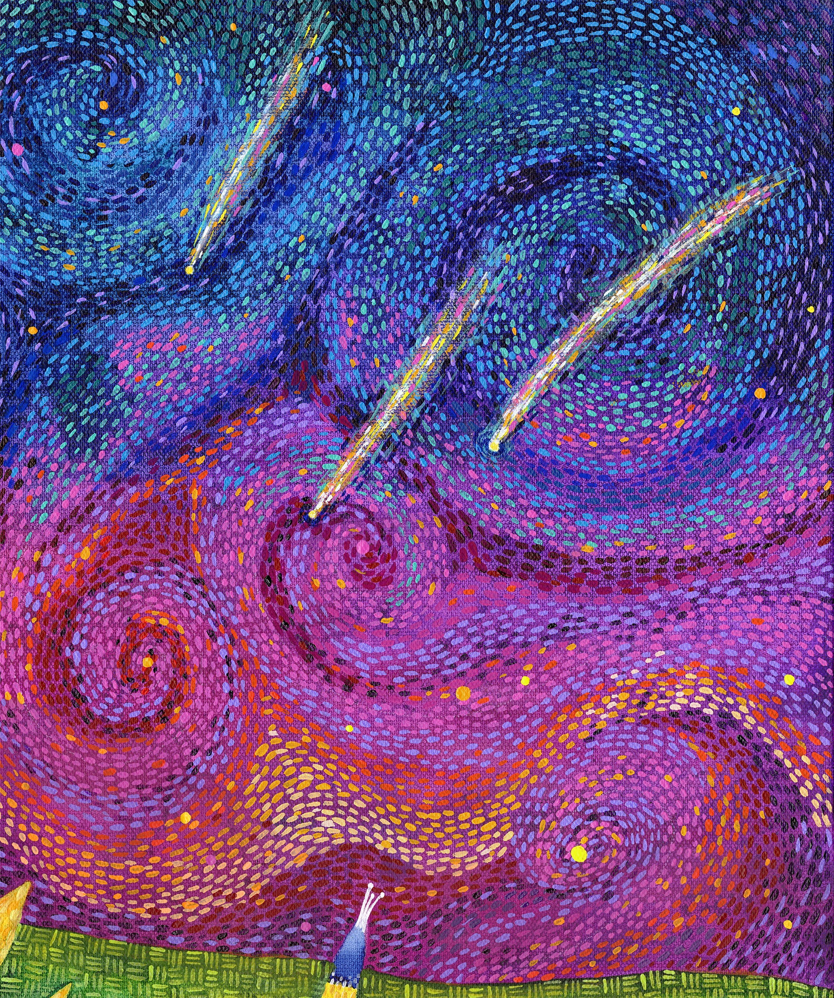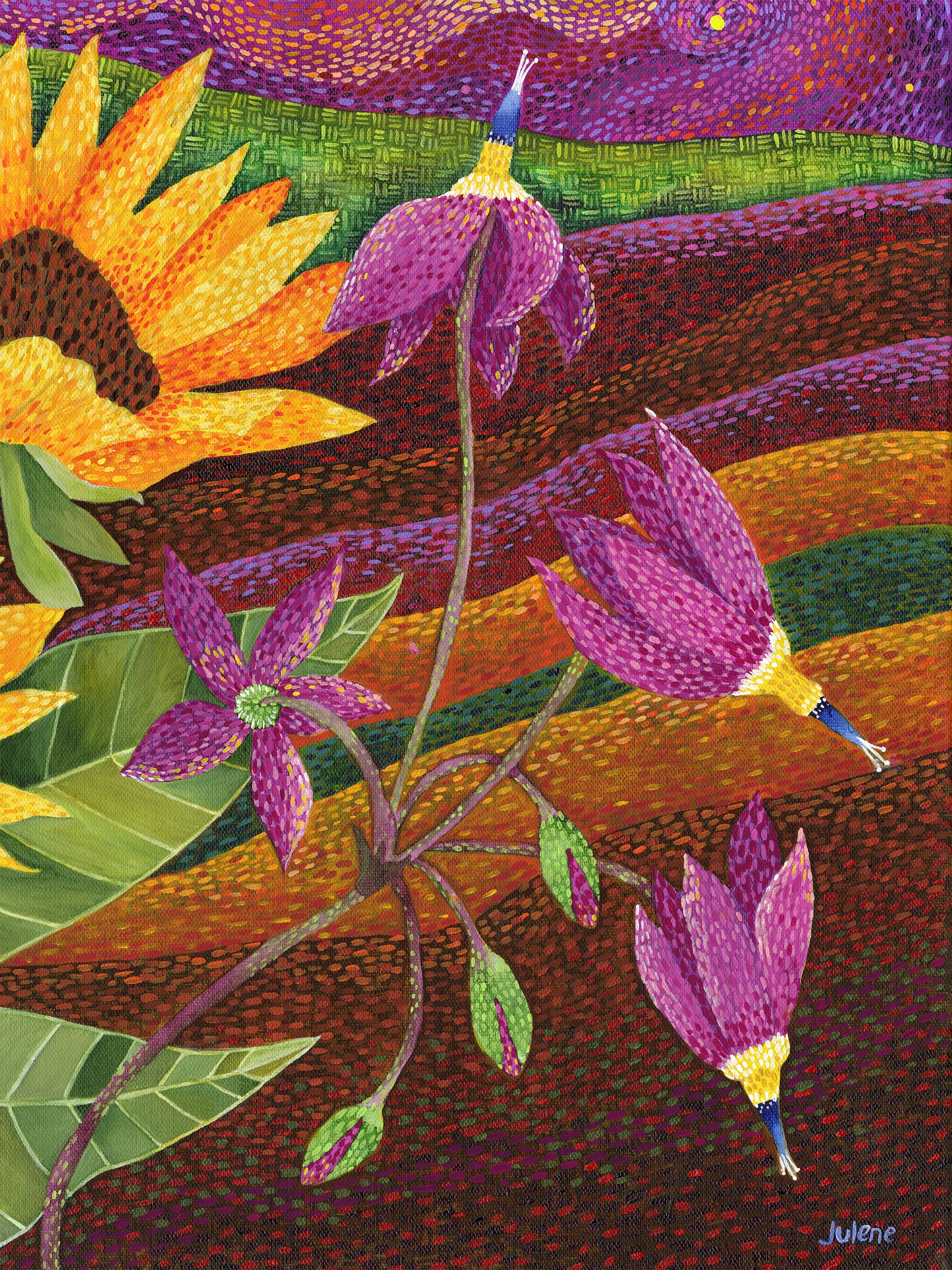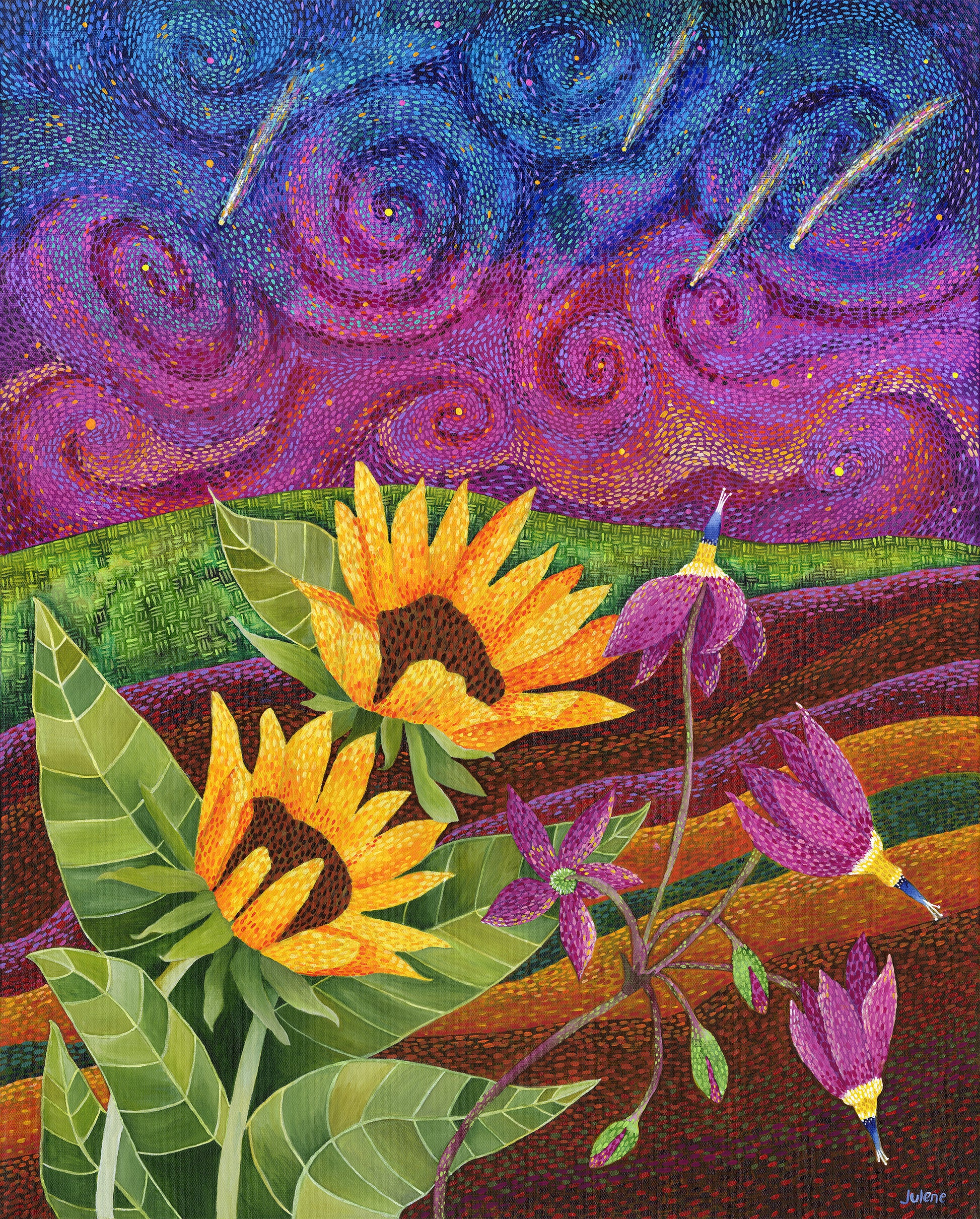 I find myself looking for shooting stars on a starry night. In hopes of seeing the quick flash of tiny meteor dust, quietly telling me I'm on the right path. It makes me reflect on my own place in this infinite universe. The delicate but mighty Shooting Star flower reminds my soul of our inheritance of this precious earth. Her graceful nod that I'm protected by the gods. The radiant golden Arrowleaf Balsamroot flower extends her roots deep into the soil. Grounded in the sanctuary of the shooting star.